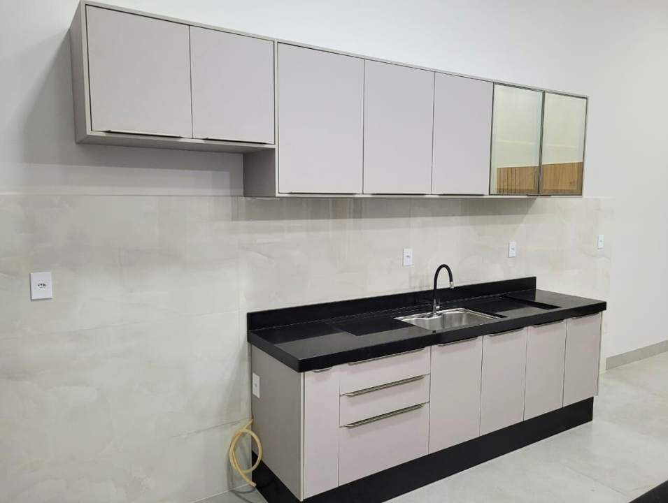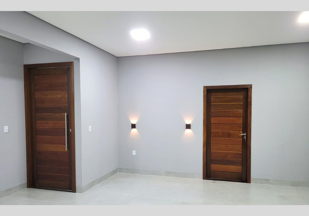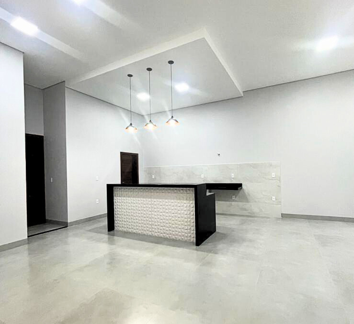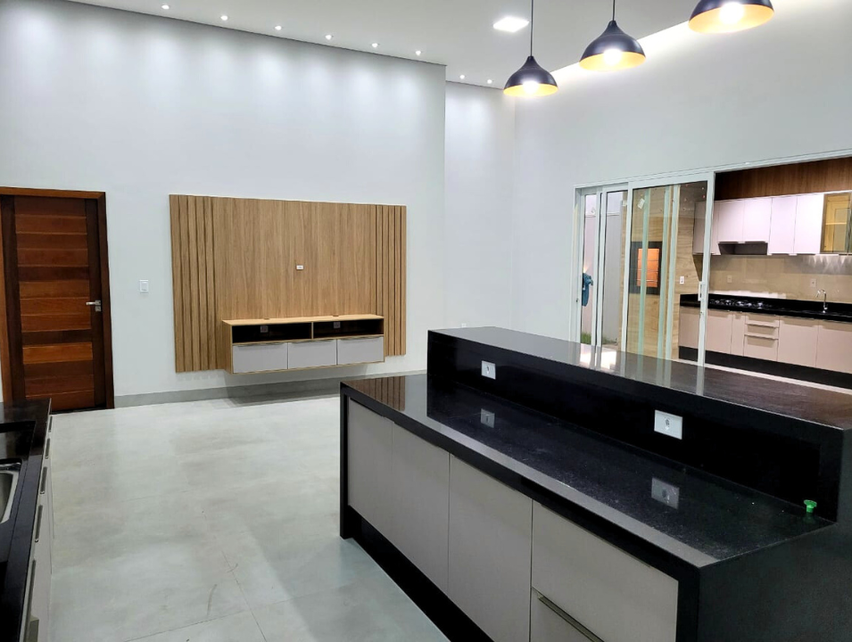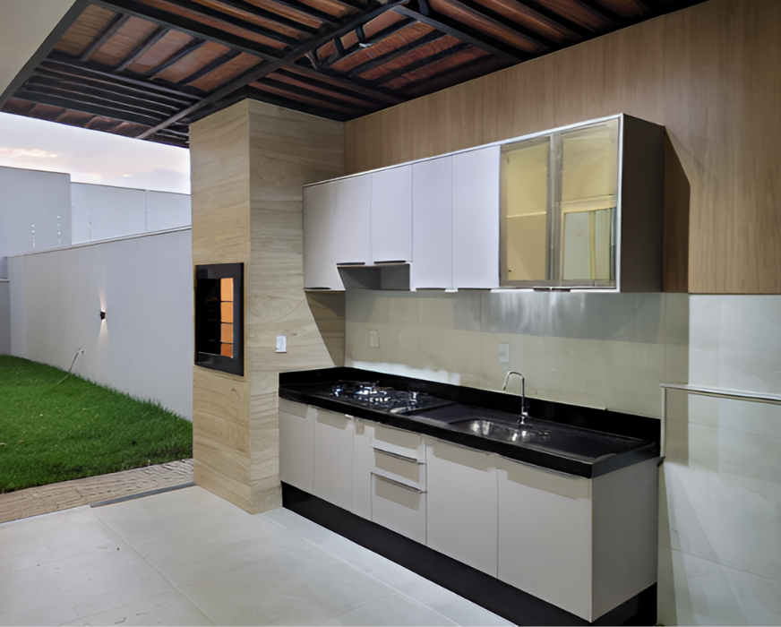 São 3 quartos, 1 deles sendo suíte com closet, 1 banheiro social interno e 1 outro externo, cozinha bem ampla interligada à área gourmet com churrasqueira, móveis planejados, quintal bem amplo para instalação de piscina e