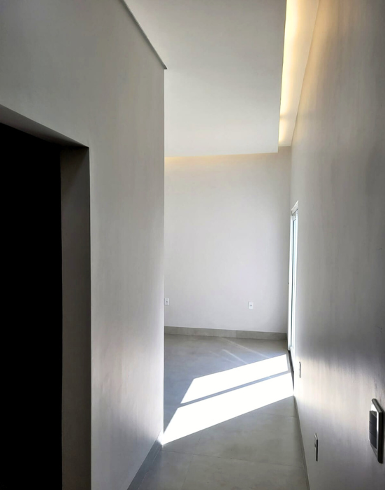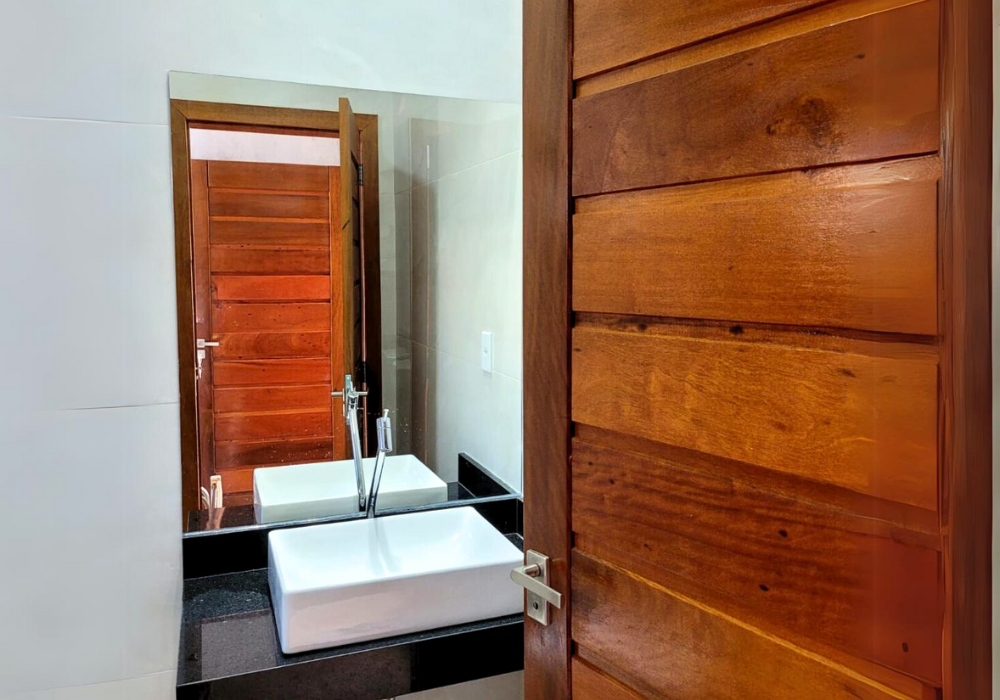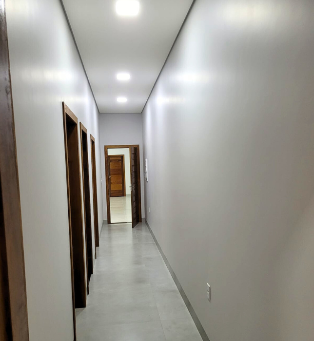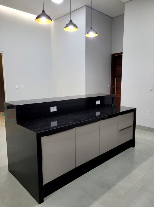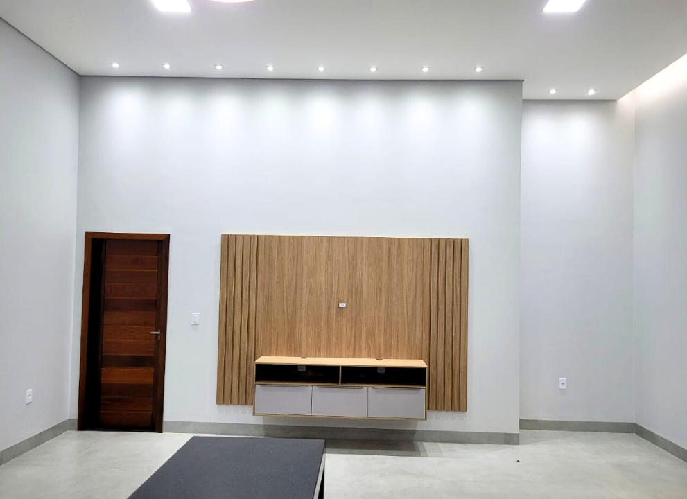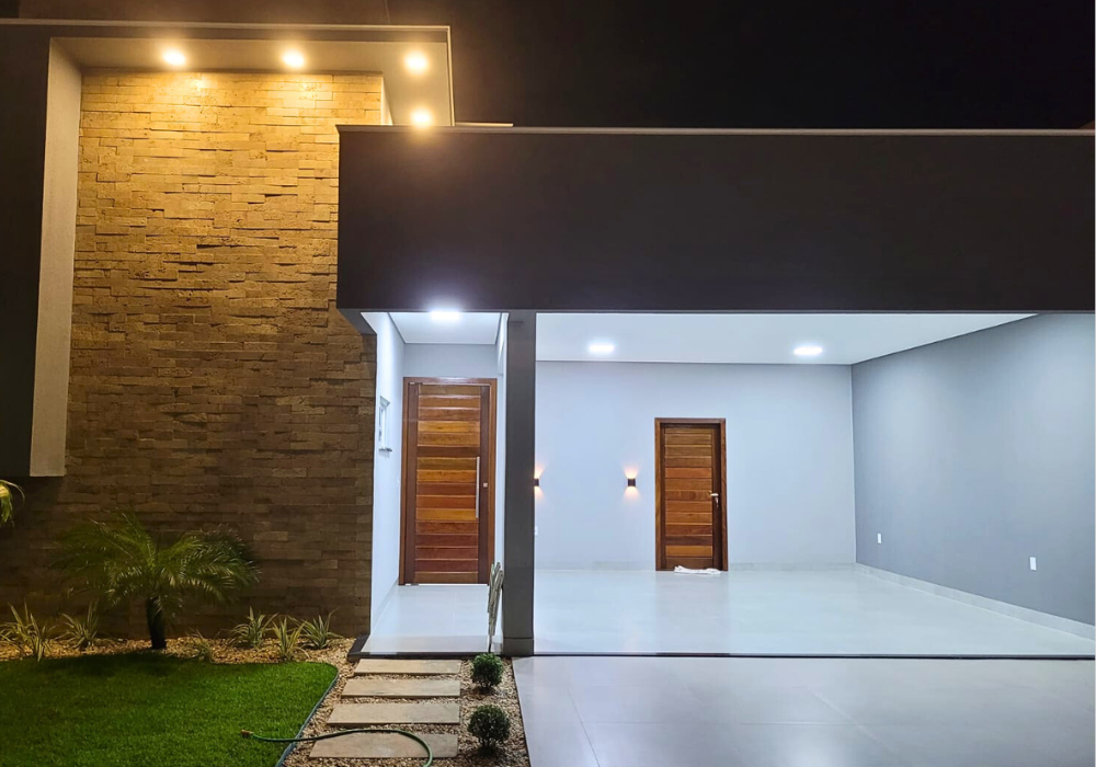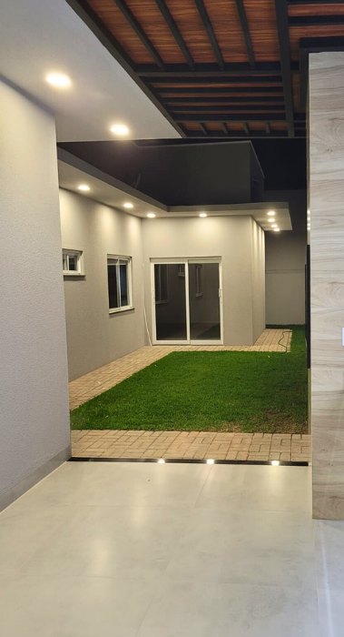 São 3 quartos, 1 deles sendo suíte com closet, 1 banheiro social interno e 1 outro externo, cozinha bem ampla interligada à área gourmet com churrasqueira, móveis planejados, quintal bem amplo para instalação de piscina e